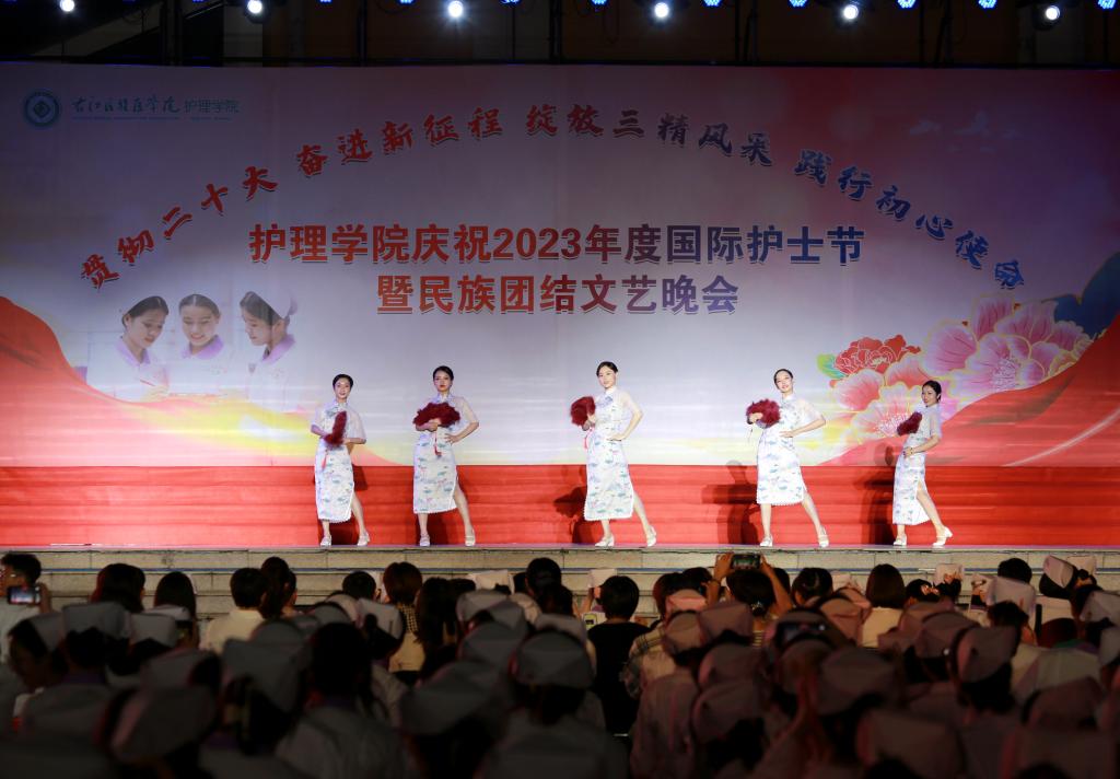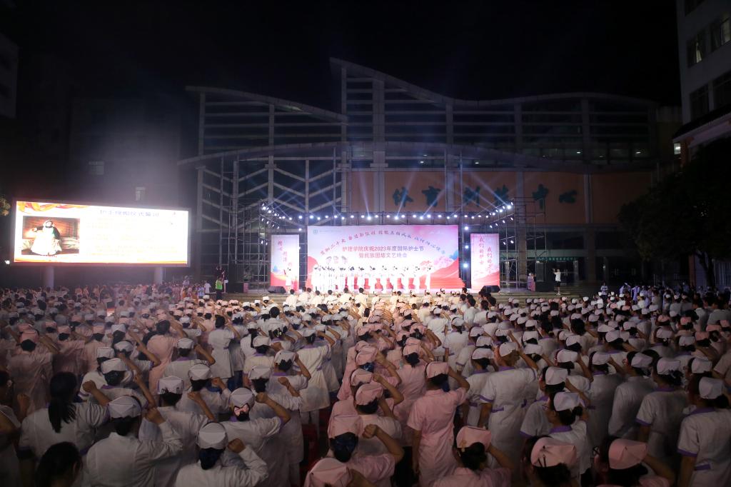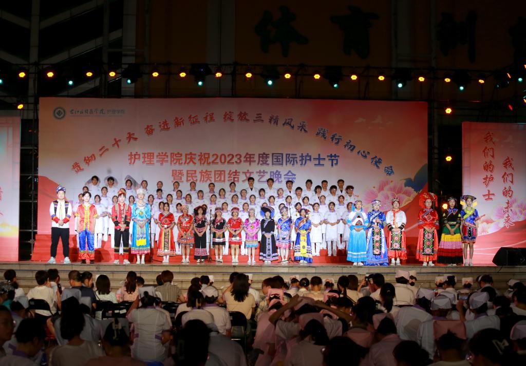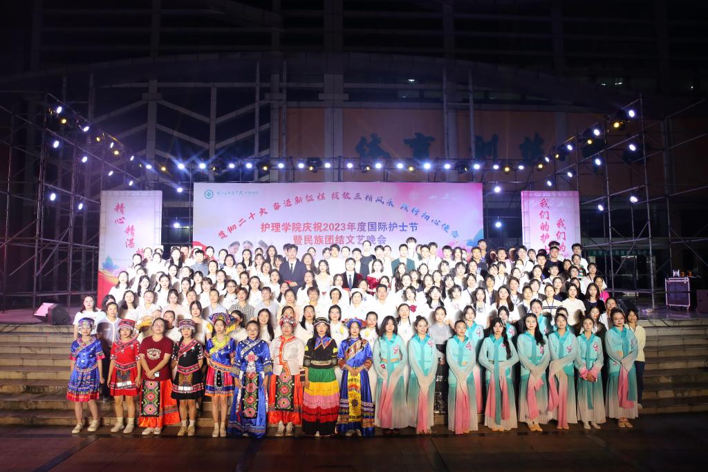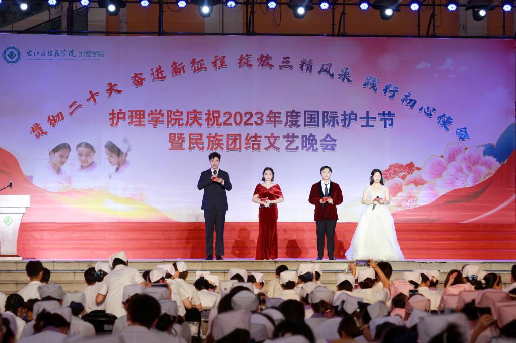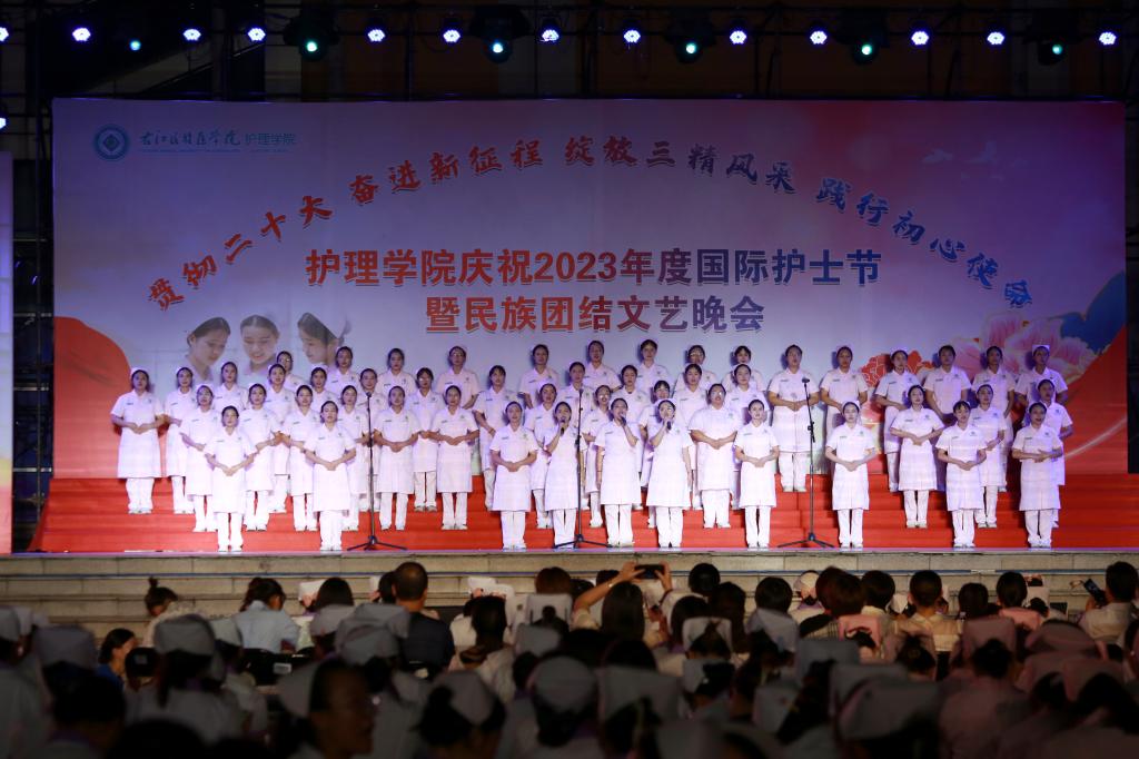 翩翩杏林挥汗影,袅袅白衣照柔情。5月20日晚上,由护理学院、护理学院共青团委员会、护理学院学生会共同主办的主题为“贯彻党的二十大精神,奋进新征程,绽放三精风采,践行初心使命”国际护士节暨民族团结文艺晚会在鸭脖大医广场隆重上演。护理学院全体师生参加活动。