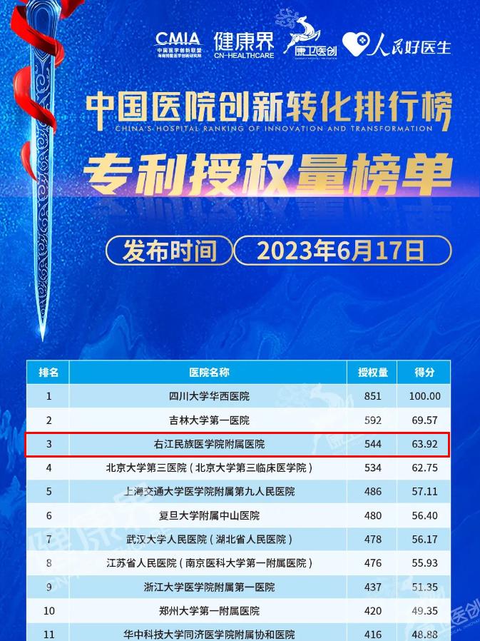 近日,由中国医学创新联盟(CMIA)和健康界联合推出的《中国医院创新转化排行榜(2022)》在2023第五届中国医学创新峰会·CMIA琅琊汇上重磅发布。该榜单由中国科学院院士,中国医学创新联盟总发起人、理事长葛均波教授领衔,联合国内30余家顶级三甲医院与行业院士专家共同发起。在本次排行榜上,鸭脖临床医学院(附属医院)荣获综合榜单全国第50位、专利授权量榜单全国第3位,专利授权量为544件,位居桂西地区医疗卫生机构首位。