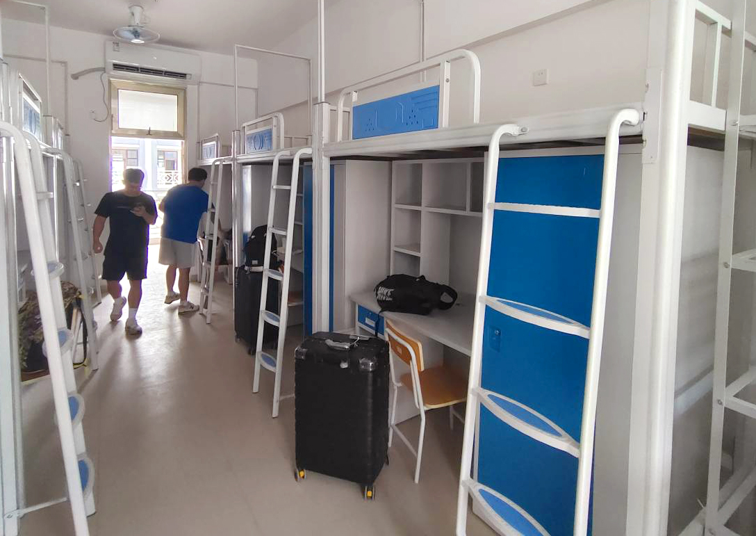 在新宿舍楼里,同学们找到了自己的宿舍,6人一间,设盥洗区域、单独洗手间,床铺书桌空调全面就位,大家都很兴奋,在一起铺床,打扫卫生,对新宿舍赞扬有加。22临本5班罗泽龙说,宿舍以前是8人间,现在是6人间,上床下桌,有空调,还有2个独立卫生间,感觉真是太好了!