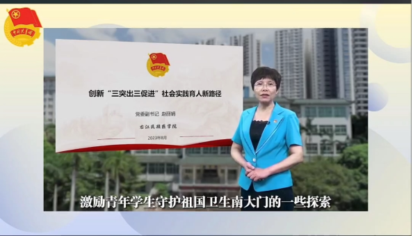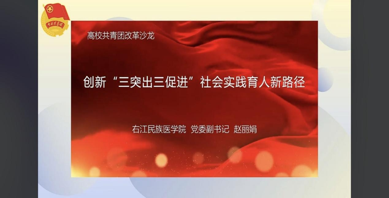 赵丽娟副书记以“创新‘三突出三促进’社会实践育人新路径”为题,分享了鸭脖扎实推进党建带团建,创新社会实践育人新路径,将红色文化教育、专业知识教育、创新创业教育融入社会实践,形成了“三突出三促进”社会实践育人模式,引导广大右医青年积极投身社会实践中成长成才,成为守护祖国卫生南大门的生力军,让青春在祖国和人民最需要的地方绽放绚丽之花。
