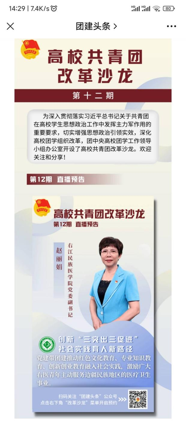 2023年8月23日下午,鸭脖党委副书记赵丽娟在共青团改革沙龙平台上分享学校共青团改革经验,全国团干和青年学生们通过“团建头条”公众号观看直播。