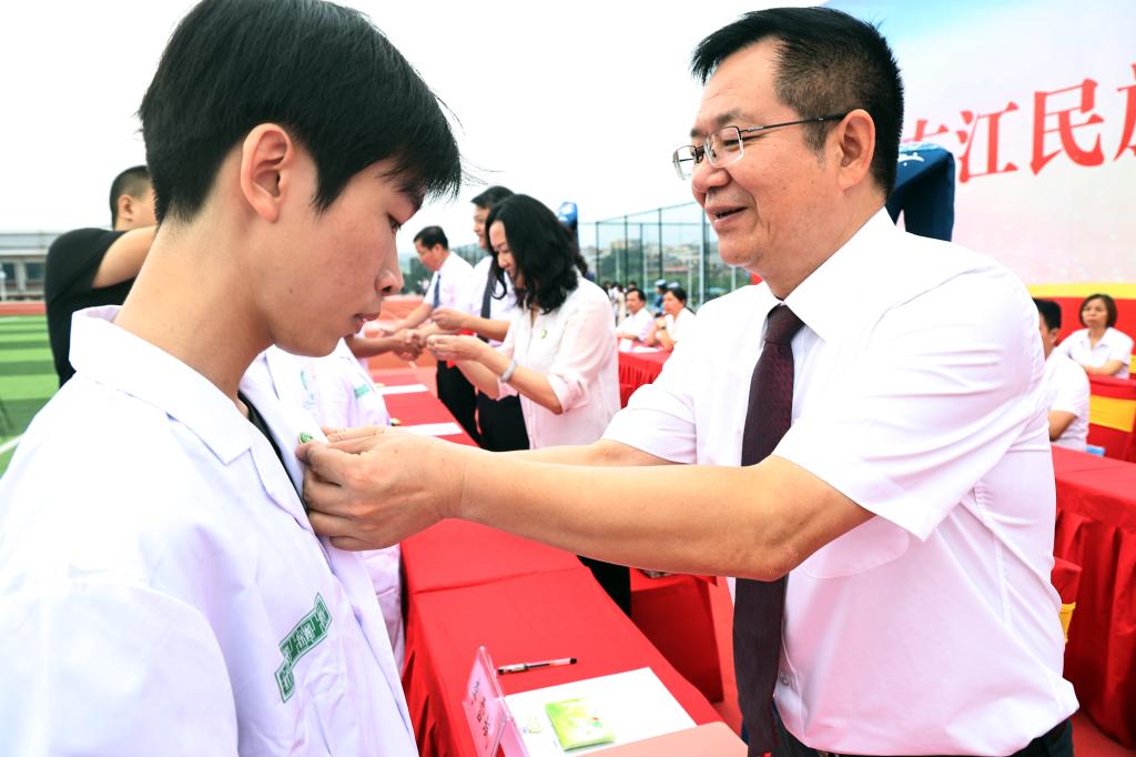 在今年的开学典礼上,首次安排校领导为新同学佩戴校徽。校徽是学校的标志,也是学校精神的体现,它不仅代表着“右医人”的身份,更承载着“艰苦创业 自强不息”的右医精神,承载着右医人的使命与光荣。学校党委副书记、校长李雪斌在典礼上亲手为新生代表戴上YABO鸭脖官网校徽,希望通过面对面、手把手的充满仪式感的交接,激发同学们的自豪感和归属感,激励同学们不忘初心,砥砺前行,执着追求,共同谱写YABO鸭脖官网辉煌壮丽的新华章,为建设新时代区域性高水平医科大学,守护祖国卫生南大门贡献青春智慧和力量!