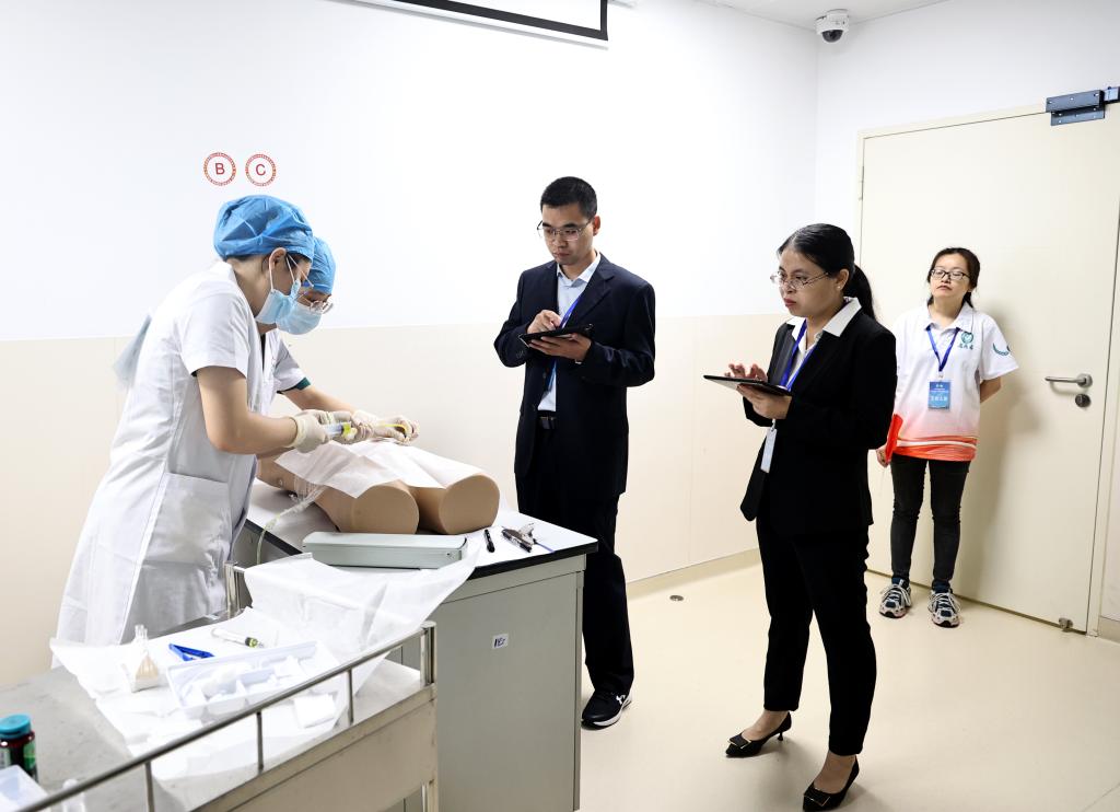 群英汇聚赛技能,匠心能手展风采。开幕式后,紧张刺激的大赛正式拉开序幕。本次大赛分初赛和决赛两个阶段,涵盖了内科、外科、妇产科、儿科等科的基本临床技能操作和临床诊疗思维的考察。每支参赛队由3名选手组成,初赛为赛站式技能考试、决赛为赛道式技能考试,选手们既要完成指定内容的操作,同时还要模拟与患者进行简单沟通,在比赛中过程中综合考察选手们的临床基本技能、人文关怀精神以及理论联系实际的能力。