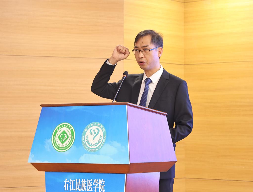 梧州市卫生健康委员会党组书记、主任宁金沛在致辞时希望附属梧州医院要牢牢把握好这次机遇,立足新时代,把握新形势,以习近平新时代中国特色社会主义思想为指导,牢固树立新发展理念,深入落实“健康中国”、“健康广西”战略,主动对接医教协同,充分发挥人才、智力、科技、资源优势,聚焦内涵发展,优化学科结构,调整专业布局,深化综合改革,突出特色优势,大力实施产学研一体化战略,推进医院实现更高水平、更可持续的发展,为梧州市经济社会发展作出新的更大贡献。