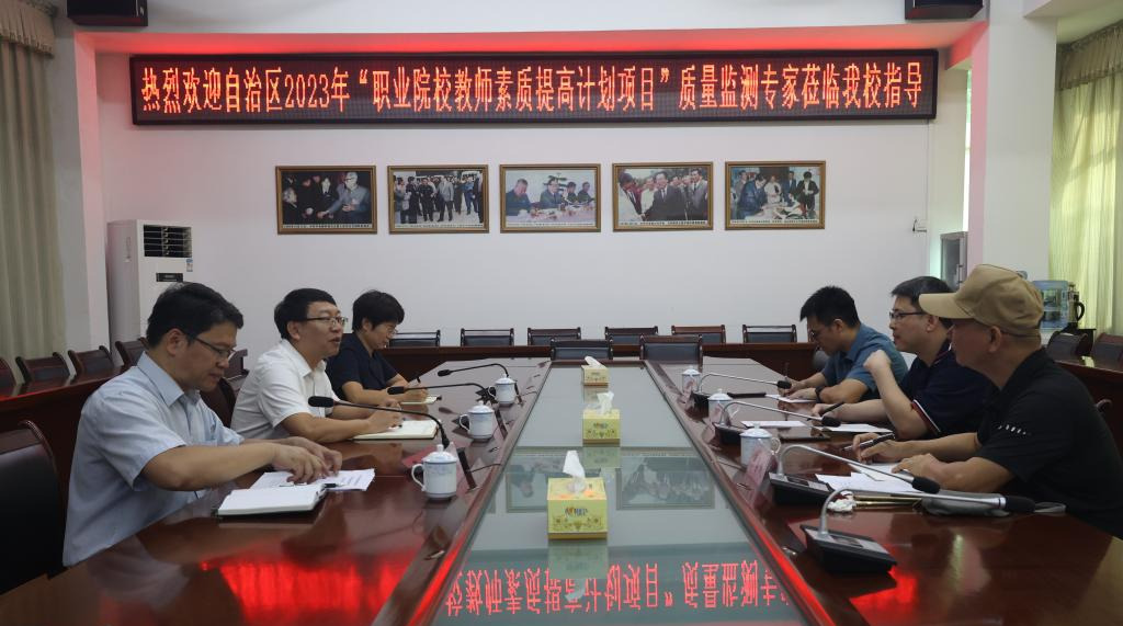 9月22日上午,2023年广西职业院校教师素质提高计划——中高本专业协同建设培训项目质量监测专家陈正振、卢勇威、吴天元到鸭脖指导,鸭脖在图书馆二楼会议室召开工作汇报会,学校党委常委、副校长王俊利出席会议。