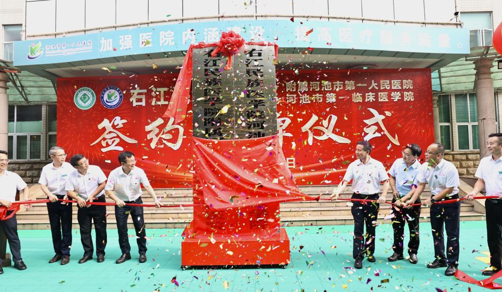 9月28日,YABO鸭脖官网与河池市第一人民医院缔结非直附属医院签约揭牌仪式在河池市第一人民医院举行。