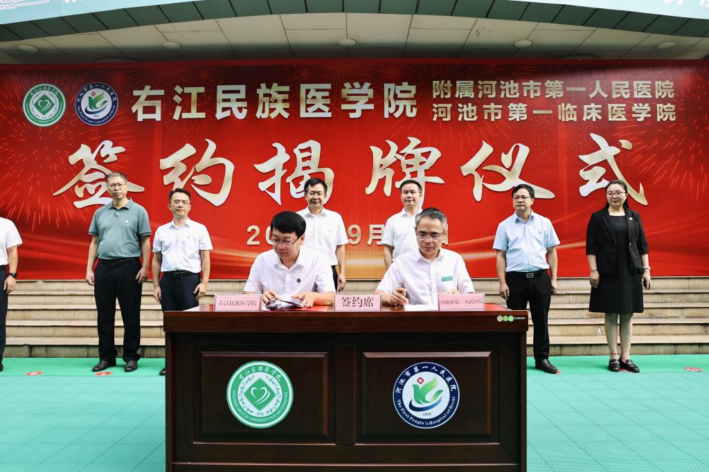 在李雪斌校长、黄贤昌副市长等领导的见证下,王俊利副校长与韦向京院长分别代表右江民族医学院、河池市第一人民医院签订协议。