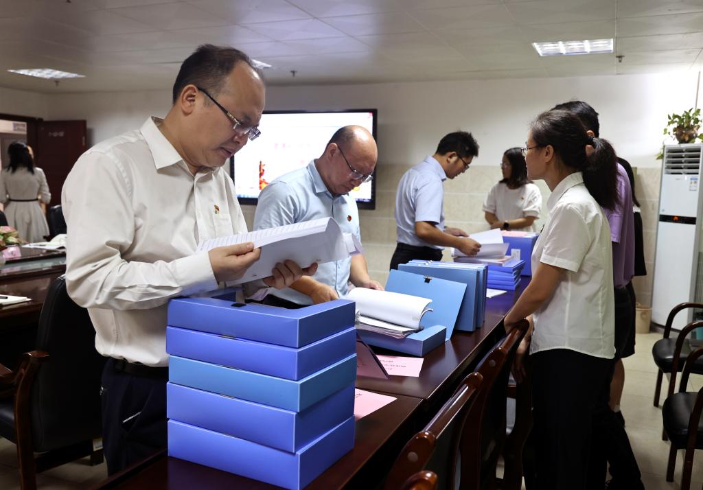 验收组对“标杆院系”和“样板支部”创建材料进行查阅。