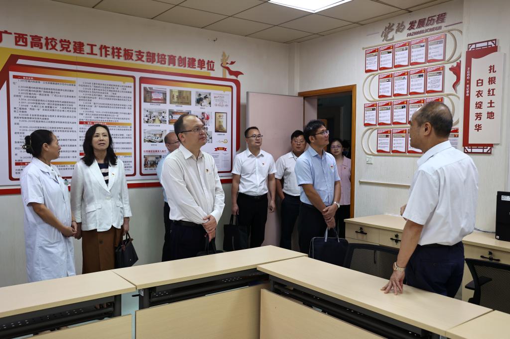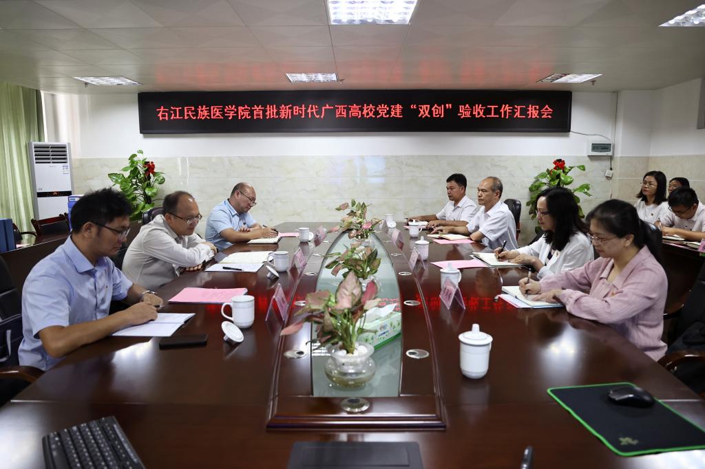 10月9日上午,自治区党委教育工委首批新时代广西高校党建“双创”工作验收第一小组组长、桂林理工大学党委常委、组织部部长唐壮东,南宁师范大学自然资源与测绘学院党委书记、党委组织部副部长黎先,广西工业职业技术学院党委组织部副部长张敏一行3人,对鸭脖入选首批新时代广西高校党建“双创”培育创建单位——护理学院党委、机关党委组织统战党支部、医学影像学院学生第一党支部、临床医学院(附属医院)肾内科党支部等“标杆院系”和“样板支部”建设情况进行实地验收。学校党委书记邓砚,党委组织部和各培育创建单位负责同志参加有关工作。