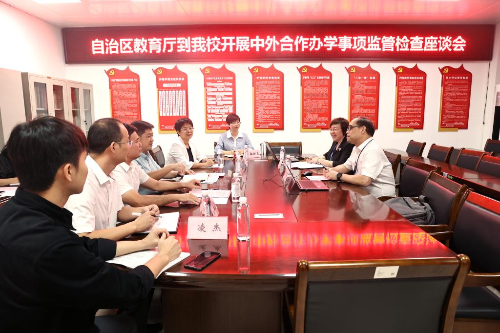 10月14日下午,自治区教育厅对外合作与交流处处长罗耀光、自治区教育厅对外合作与交流处一级调研员吕青到鸭脖开展中外合作办学事项监管现场检查。学校党委常委、副校长黄龙坚陪同检查,护理学院、马克思主义学院、财务处、国际合作与交流中心等部门相关负责人参加会议。
