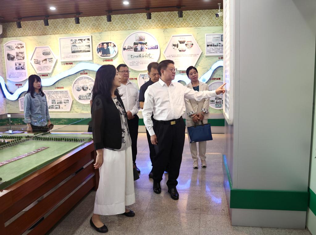 蒋和生主委在参观学校校史馆。