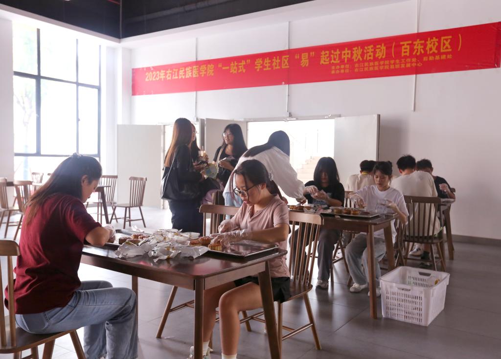当天下午3时,两个校区的“一站式”学生社区服务站里饼香四溢,由学校食堂工作人员精心制作,新鲜出炉的月饼整齐的摆放着,各班级代表有序的排队领取月,现场热闹非凡。“这些月饼食材选取、到揉面包馅制作、再到烘烤出炉,每个步骤都倾注了工作人员的辛勤汗水。”学校食堂相关负责人介绍道,月饼虽小,但意义却大,它代表着学校对右医学子们的中秋祝福和浓浓关爱。在分发月饼的同时,“一站式”学生社区服务站的工作人员还切好了豆沙、豆蓉、白莲等不同馅料的月饼,供学校师生品尝。