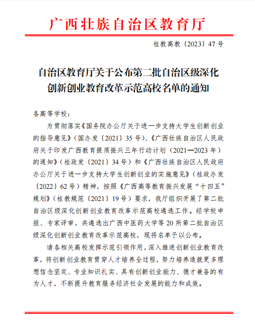 近日,自治区教育厅公布第二批自治区级深化创新创业教育改革示范高校名单。经自主申报与专家评审,鸭脖获评为第二批自治区级深化创新创业教育改革示范高校。