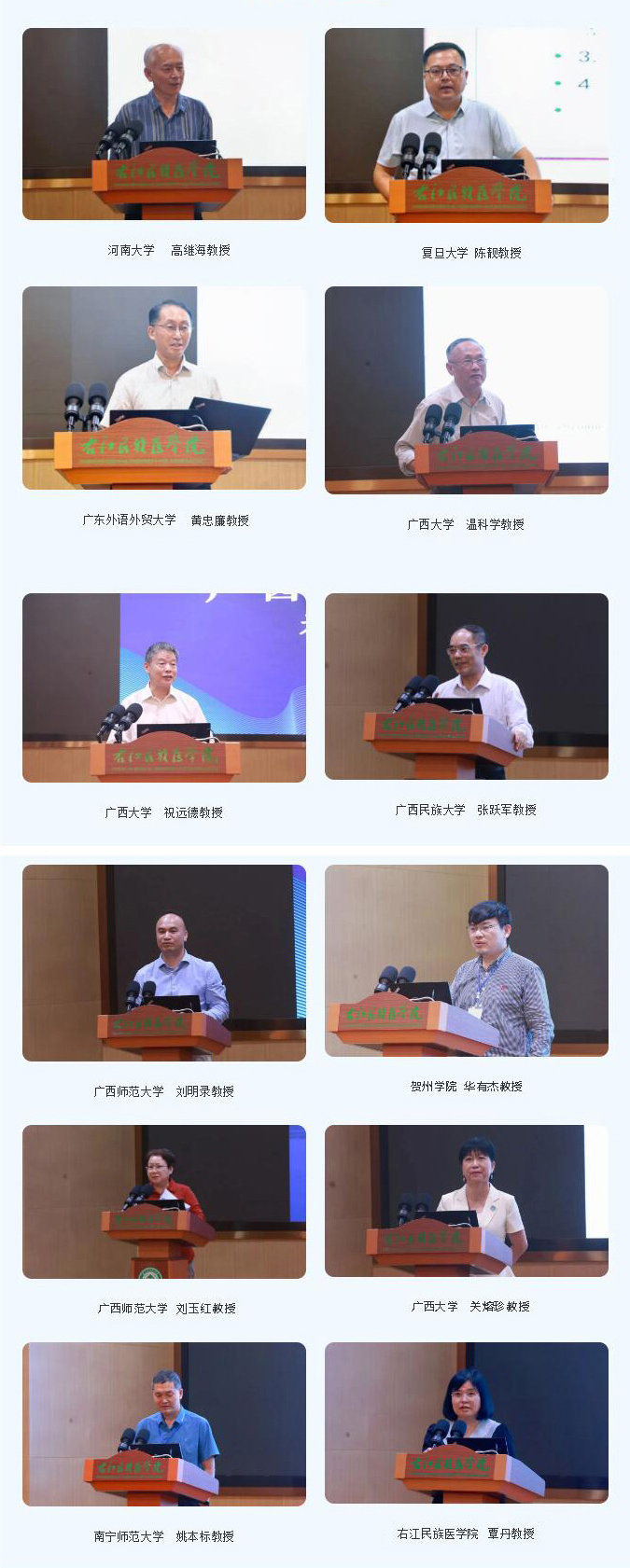 在本次学术研讨会上大咖云集。河南大学高继海教授、复旦大学外文学院陈靓教授、广东外语外贸大学黄忠廉教授、广西大学祝远德教授、广西师范大学外国语学院刘明录教授、贺州学院外国语学院华有杰教授、广西师范大学外国语学院刘玉红教授、广西大学温科学教授、广西民族大学张跃军教授、广西大学国际学院关熔珍教授、南宁师范大学外国语学院姚本标教授、YABO鸭脖官网国际语言文化教育学院覃丹教授等12位专家教授在国际会议中心二楼学术报告厅进行了专题主旨发言,分享他们最新的研究成果和独到的见解,通过多视角的研究,多维度的分析,以及多学科的交流,探讨外国文学的不同方面和层面,从而促进文学的联通世界,跨越地域的藩篱,促进文化交流和文明互鉴。