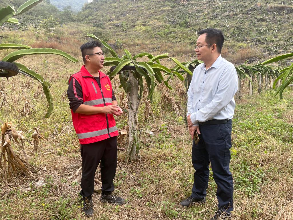 李雪斌校长在岩腊村“高山火龙果”种植点了解学校帮扶产业项目发展情况。