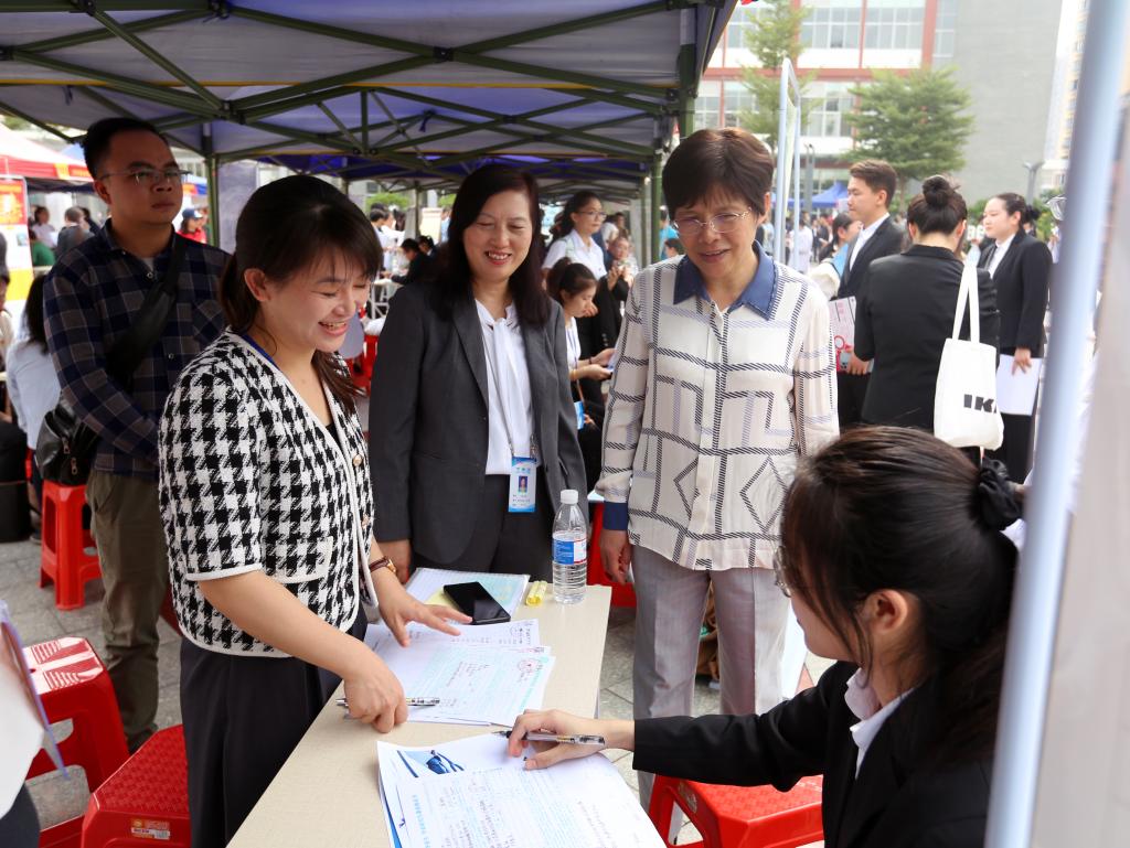 11月9日上午,学校领导赵丽娟、周艳娥、黄龙坚、冼季夏、解继胜、谭盛葵、王俊利到鸭脖2024届校园“双选”会现场检查指导工作,两办、招生就业工作处等相关部门负责人陪同检查。