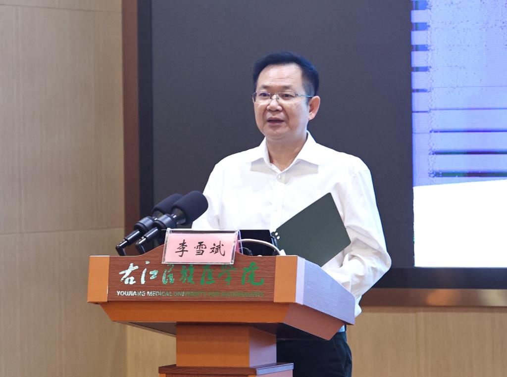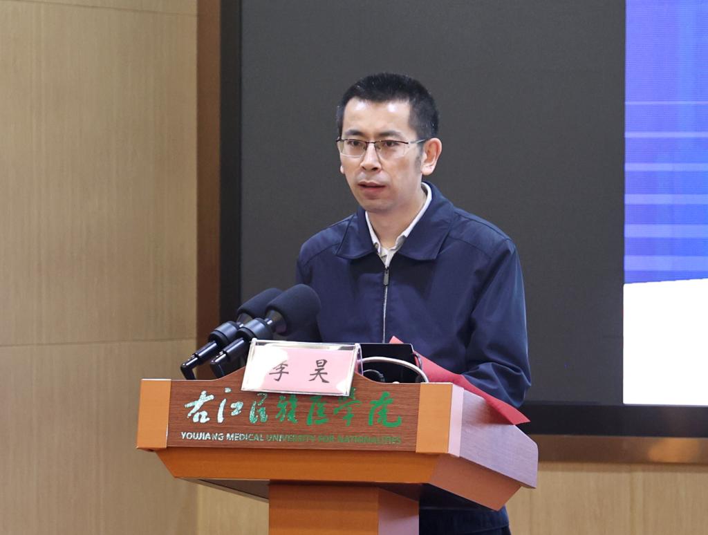 李雪斌校长在致辞中表示,今天到会的宣讲团成员都是钟南山青年科技创新奖获奖者,他们在医疗领域有突出的成绩。此次宣讲团来到右医,是国内优秀青年科技工作者为青年学子点亮科技强国梦想的一次重要活动,是团中央、团区委给予右医青年的厚爱。鸭脖将以此次活动为契机,真诚地期盼能够加强与各位专家领导沟通交流,建立常态化指导交流机制,给予鸭脖更多指导和帮助。希望鸭脖老师及同学们能够珍惜这次难得的交流学习机会,能以钟南山等科学家为榜样,在科学前沿孜孜求索,在重大科技领域不断取得突破,在强国建设、民族复兴的历史进程中挺膺担当。