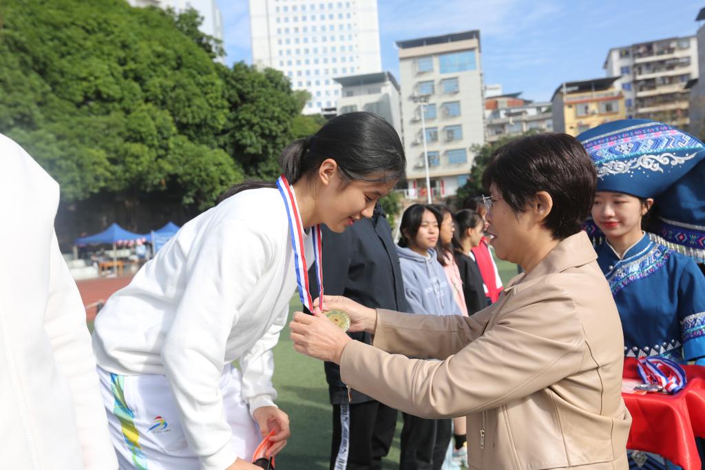 11月17日上午10点,鸭脖举行第五十届校运会第一场颁奖仪式,由学校党委副书记赵丽娟为获奖运动员颁奖,来自2022级预防2班的陈可怡同学在女子100米决赛上发挥出色,以13秒8的好成绩斩获金牌,取得本届运动会的首枚金牌。