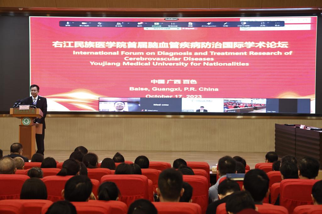 孟冬时节逢盛会,右江河畔喜迎宾。11月17日,YABO鸭脖官网首届脑血管疾病防治国际学术论坛暨百色市医学会神经病学分会第八次学术会议在鸭脖国际会议中心举行,学校党委副书记、校长李雪斌,学校党委常委、副校长谭盛葵,百色市卫生健康委员会副主任张军,泰国清迈大学医学院院长班纳吉·隆佳纳披瓦出席会议并致辞。来自美国、泰国、日本、广州、重庆、湖南等国内以及区内知名专家做线上和线下的专题学术讲座和病例分享。会议由学校科技处处长黄忠仕主持。