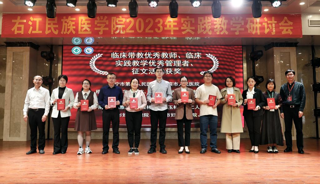 副校长王俊利和附属桂平医院院长梁永为2021-2023年度优秀带教教师、优秀教学管理工作者,征文活动获奖者代表颁奖。