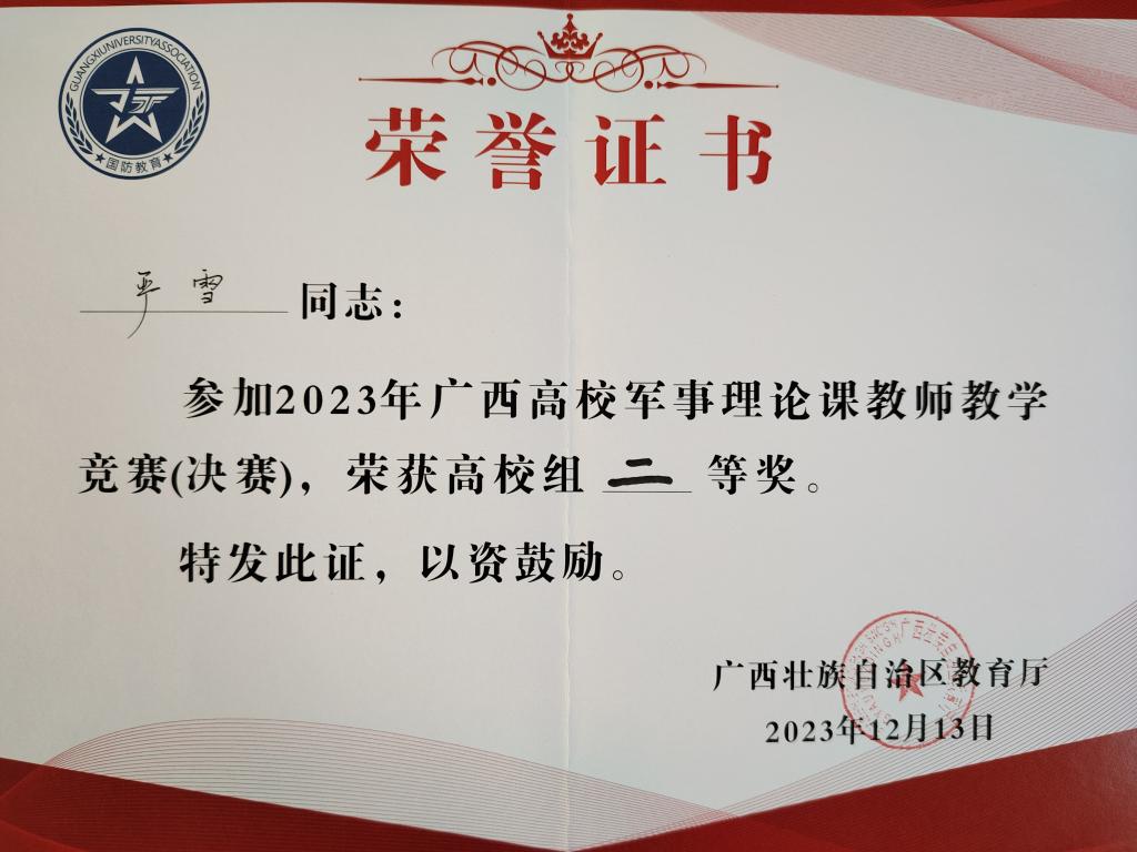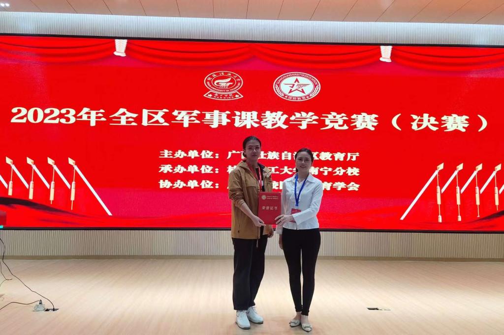12月13日,由广西壮族自治区教育厅主办、桂林理工大学南宁分校承办的2023年全区高校军事理论课教学竞赛(决赛)在崇左圆满落幕,本次竞赛全区高校共有20名教师进入决赛,学校武装部军事教研室教师严雪表现出色,最终荣获二等奖。