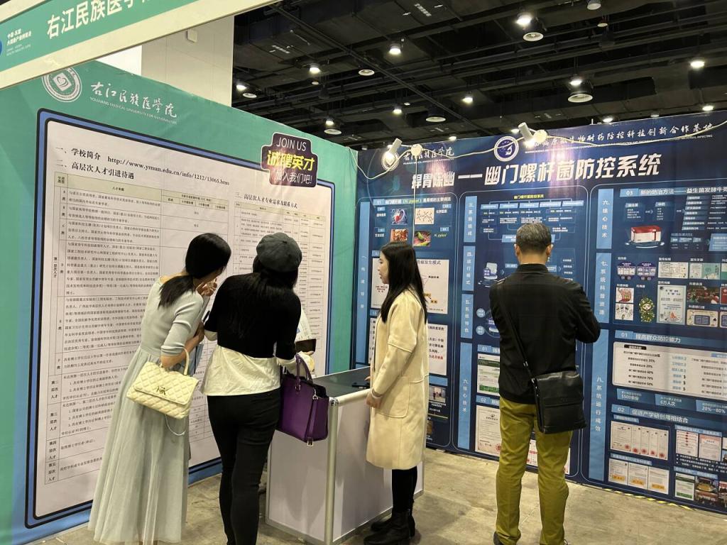 鸭脖携广西新一轮一流学科、立项建设新增博士学位授予单位建设成果参加展览,同时现场宣讲人才政策。其中黄衍强教授团队的广西病原微生物耐药防控科技创新合作基地科研成果在博览会展出,引来多位参展观众驻足咨询,反响良好。