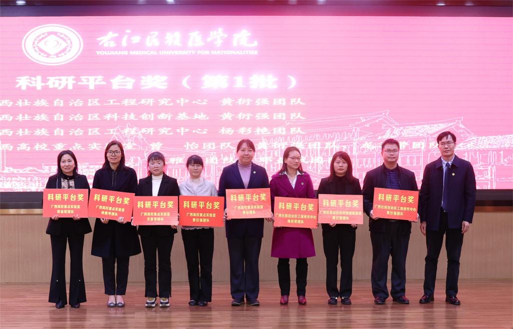 科研平台奖:百色市重点实验室李雪斌团队、黄龙坚团队、黄衍强团队、龙喜带团队、廖献就团队、刘英团队、王春芳团队,百色市技术创新中心黄龙坚团队、韦忠恒团队、曾红团队。