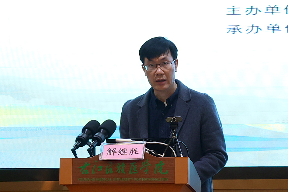 解继胜副校长指出,新医科建设与学科专业优化、创新能力提高、产学研用融合、时代新人培养有着紧密的联系。他表示,在大健康产业快速发展的趋势下,希望大家认真学习贯彻习近平总书记的重要指示精神和关于加快医学教育创新发展的要求,充分发挥院校医教研一体的优势,加强与国际、国内同行的交流对话。通过本次学术会议,形成包容多元、协同创新的学术氛围,促进基础医学学科特色研究、项目成果转化,共同促进广西生物药学基础研究与转化推广再上新台阶。