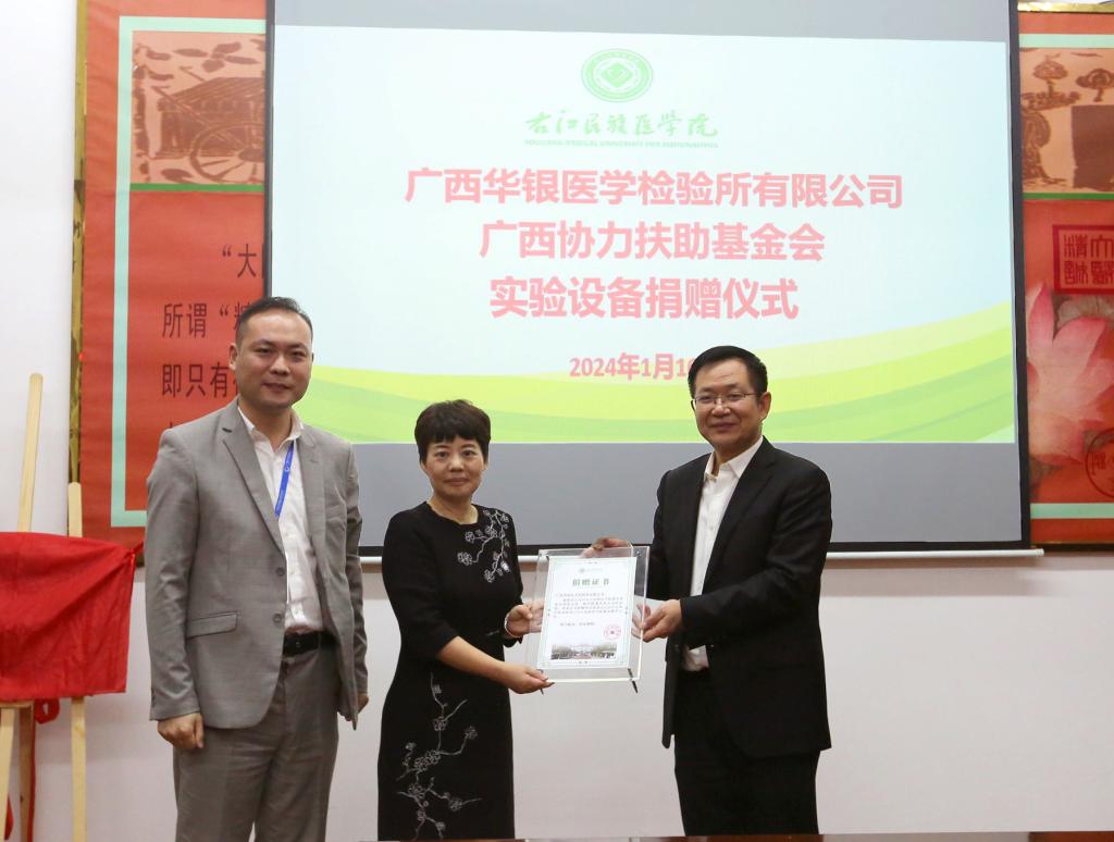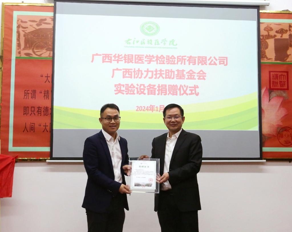 李雪斌校长代表学校接受捐赠,并分别向广西华银医学检验所有限公司、广西协力扶助基金会颁发捐赠证书。
