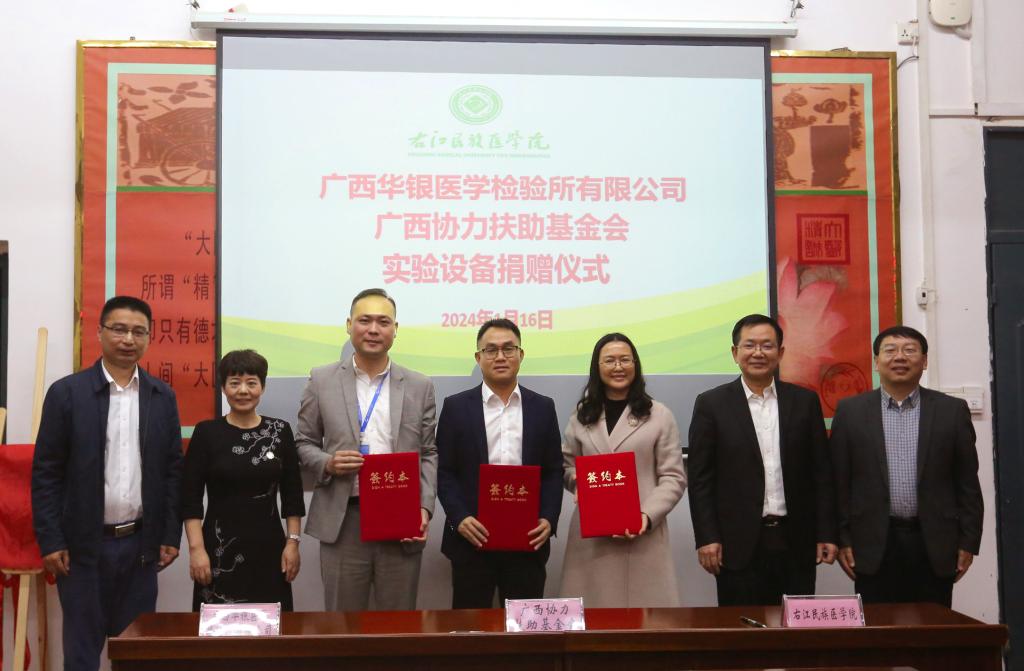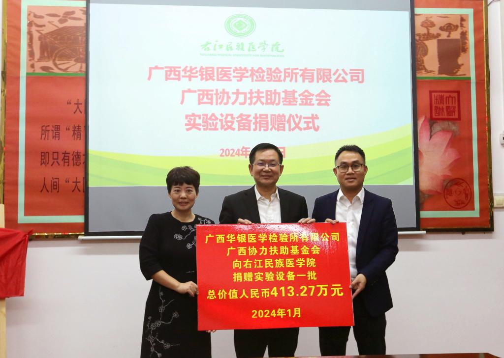 1月16日下午,广西华银医学检验所有限公司、广西协力扶助基金会向鸭脖捐赠实验室设备一批,价值400多万元。鸭脖党委副书记、校长李雪斌,党委常委、副校长周艳娥、王俊利,华银康集团高级副总裁赖波、广西华银医学检验所有限公司总经理吕显刚、广西协力扶助基金会理事莫烦、百色市乡村振兴局副局长杨杰兴等领导出席捐赠仪式。鸭脖财务处、国资处、科技处、基础医学院、药学院、医学检验学院以及附属医院、附属西南医院,广西华银医学检验所有限公司、广西协力扶助基金会等相关负责人参加捐赠仪式。捐赠仪式由王俊利副校长主持。