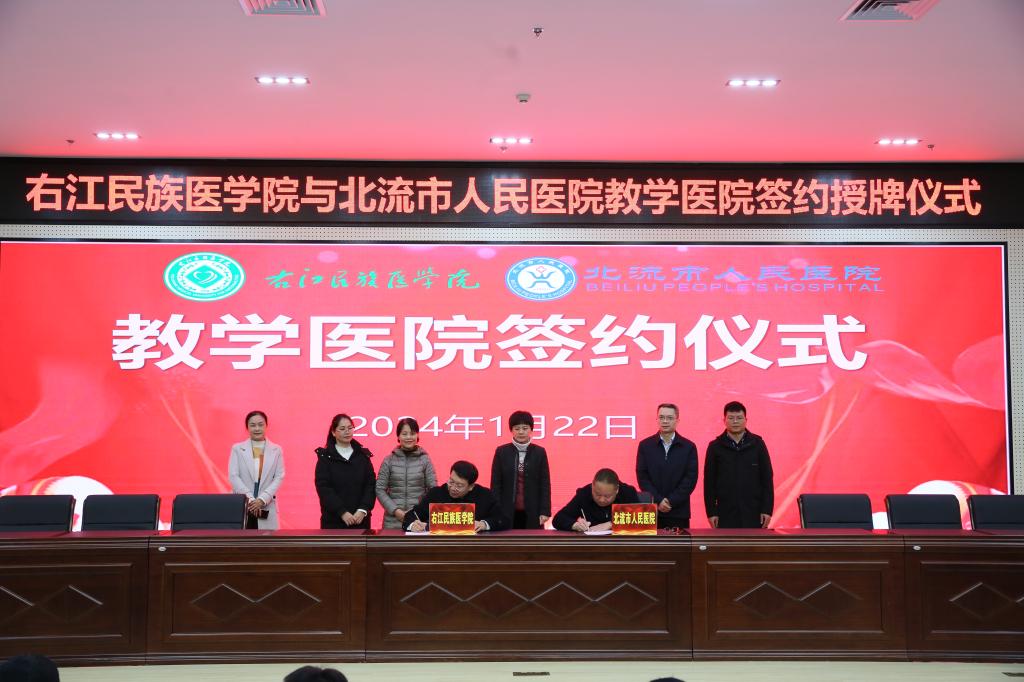学校王俊利副校长和北流市人民医院梁柱光副书记签署缔结教学医院协议。