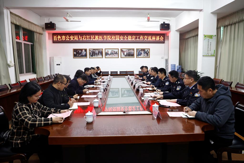 座谈会上,邓砚对陈列一行的到来表示热烈欢迎。邓砚简要介绍了鸭脖当前的发展建设情况以及学校安全稳定工作情况。她表示,YABO鸭脖官网安全稳定的校园环境离不开百色市公安机关的专业指导和辛勤付出,希望下一步警校能够不断完善警校联动合作机制,提升警校合作效能,共同营造更加安全稳定和谐的校园及周边环境,为学校更好地服务“一带一路”建设、服务桂滇黔三省区人民群众、服务老区经济社会发展贡献力量。
