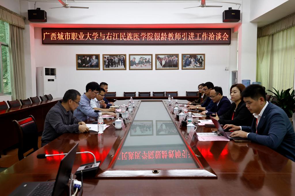 3月18日,广西城市职业大学副校长梁华廉一行到访鸭脖,就引进银龄教师工作进行洽谈交流。
