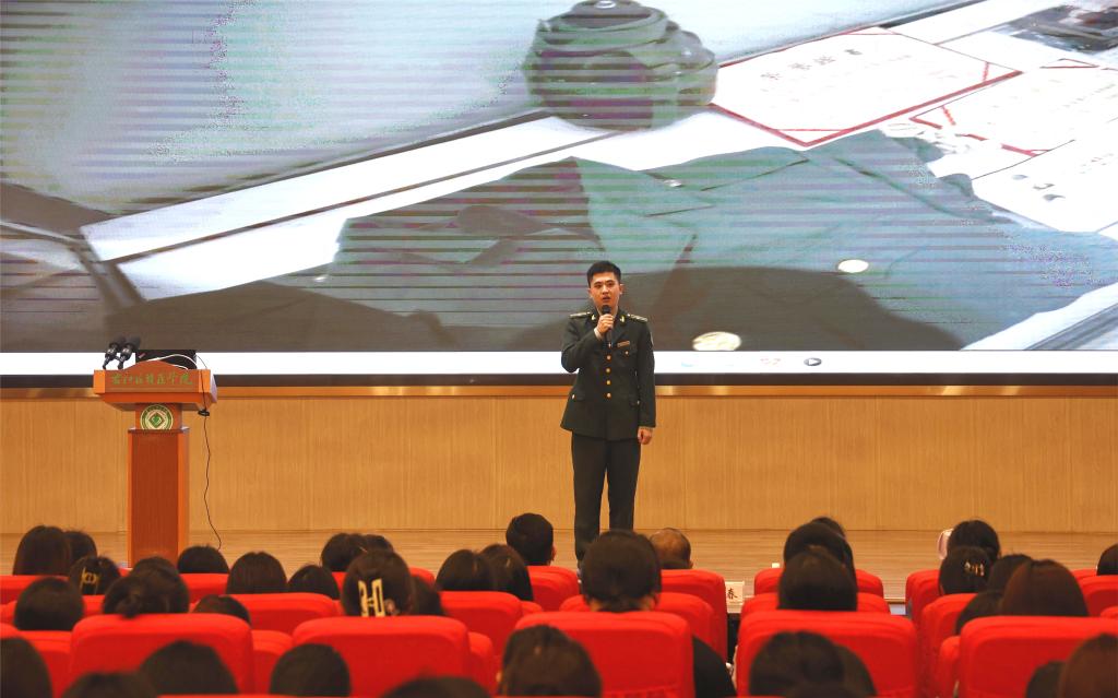 百色市宣讲团成员、百色起义纪念园管理中心黄尚城是第一次来到鸭脖宣讲,他表示听讲的大部分都是朝气勃勃的学生,让他感受到当代年轻人的激情活力。他说,今天我宣讲的人物是曾任武警广西总队百色支队乐业中队司务长覃礼广,他的一生是短暂而辉煌的一生,为了保护队友安全选择舍弃自己的生命。我想让同学们了解到,英雄就是在我们身边,他们用自己的行动来证明了自己的信仰。我在宣讲时也看到台下的同学们认真聆听,眼神中充满了对新时代英雄的崇拜,我们宣讲团也是想让更多年轻一代了解新时代的英雄故事,汲取英雄身上的优秀品质和精神力量,在建设壮美广西的道路上勇毅前行。