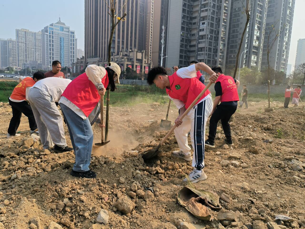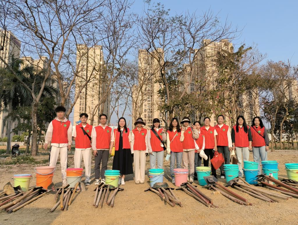 此次活动以“志愿服务+”的形式开展,号召青年群体践行“两山”理念,建设生态文明,携手开展植树活动。植树现场,在工作人员的指导下,三百多名青年分工协作,挥锹铲土、扶苗填坑、提桶浇水,认真地把每棵树苗栽实栽正,并与现场技术员确认达标保证成活,现场一片繁忙有序的劳动景象。经过大家的齐心协力,一株株黄花风铃木、扁桃树苗迎风挺立,彰显着生机盎然和朝气蓬勃。