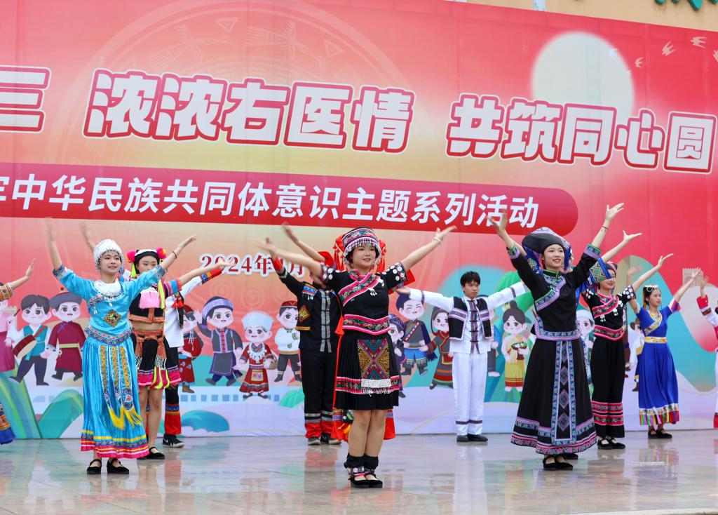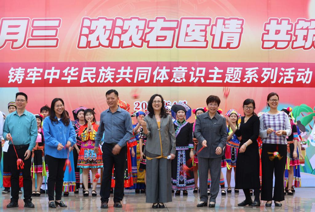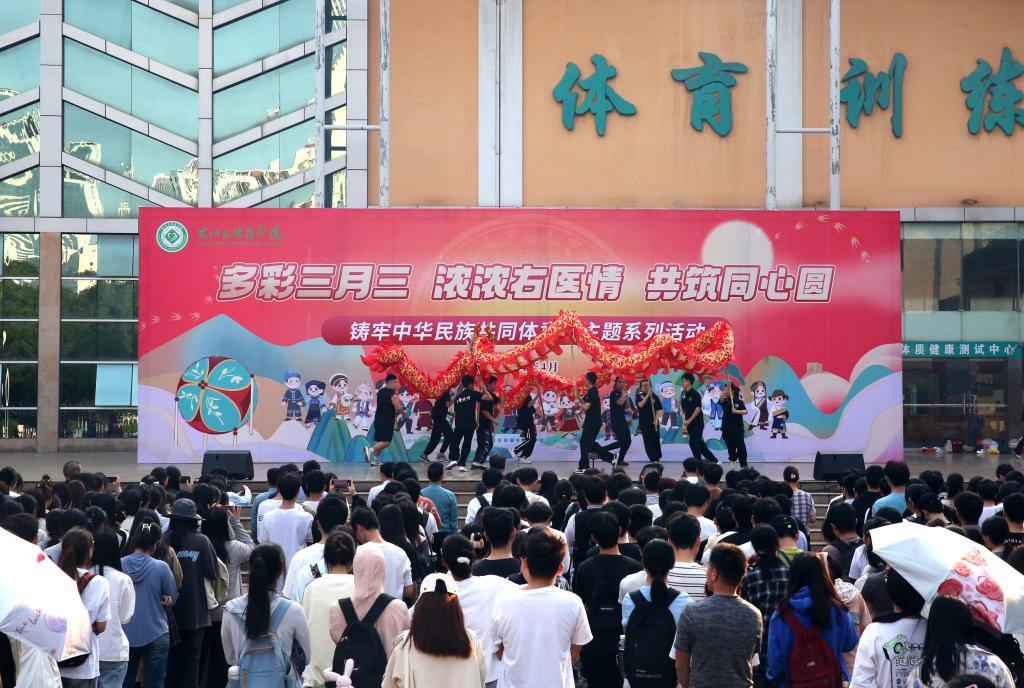 4月8日,鸭脖举行“多彩三月三 浓浓右医情 共筑同心圆”铸牢中华民族共同体意识主题系列活动启动仪式。图为百城校区会场。