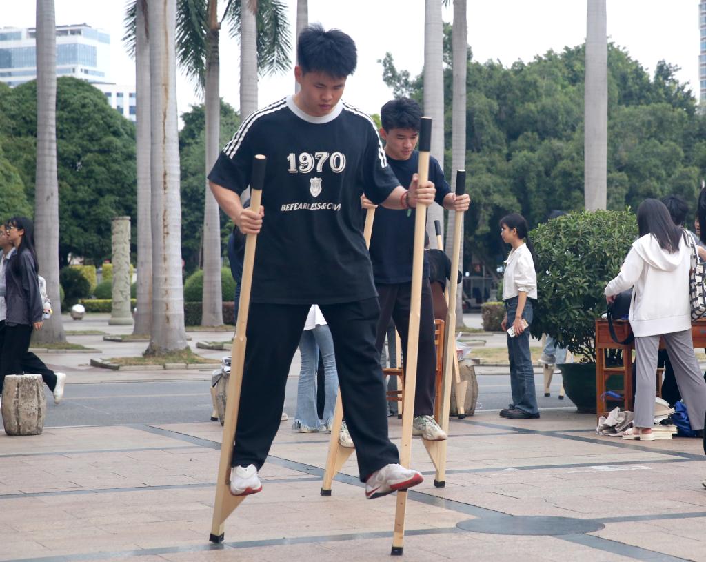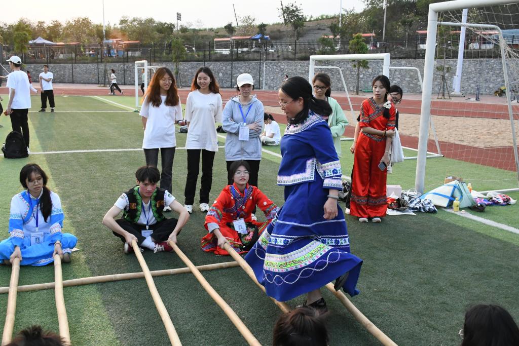 来自辽宁省的邱同学正专心学习竹竿舞,他紧跟着节奏与同学们一同跳跃起舞,玩得不亦乐乎。他兴奋地说:“这是我第一次深入感受广西三月三的民族风情,真是让我领略到了与东北截然不同的文化魅力。我已经迫不及待地把这次活动分享给家人了,他们听后都十分心动,表示有机会很想一起来体验三月三的独特氛围。”
