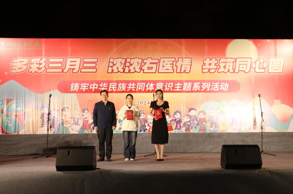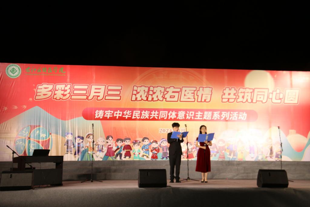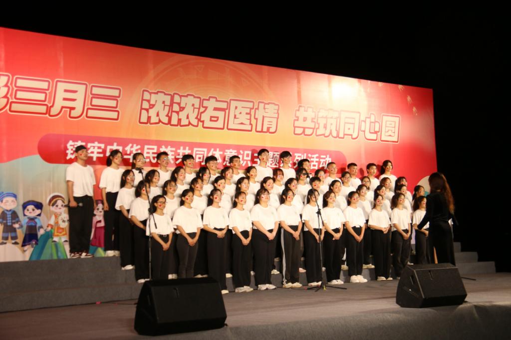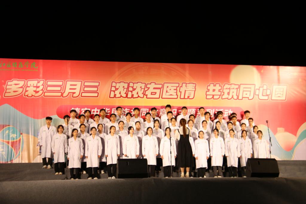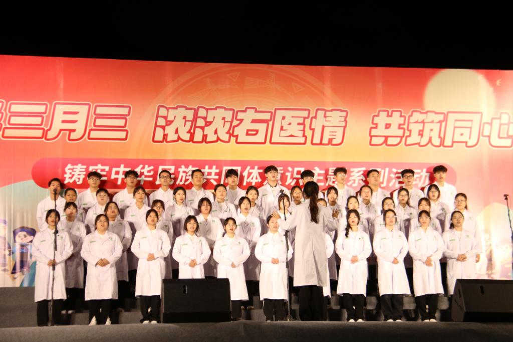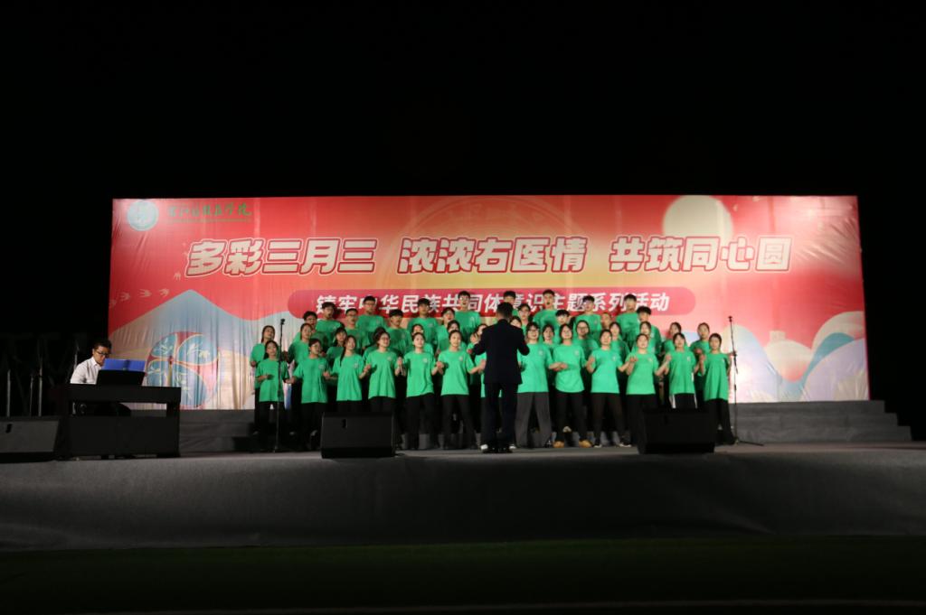 为弘扬⺠族文化,丰富校园文化生活,促进⺠族团结,当晚,鸭脖在百东校区举行以“唱响主旋律,畅想右医梦”为主题的歌咏比赛。校领导邓砚、李雪斌、赵丽娟、黄龙坚、冼季夏、解继胜、王俊利以及各二级学院师生代表到场观看比赛。