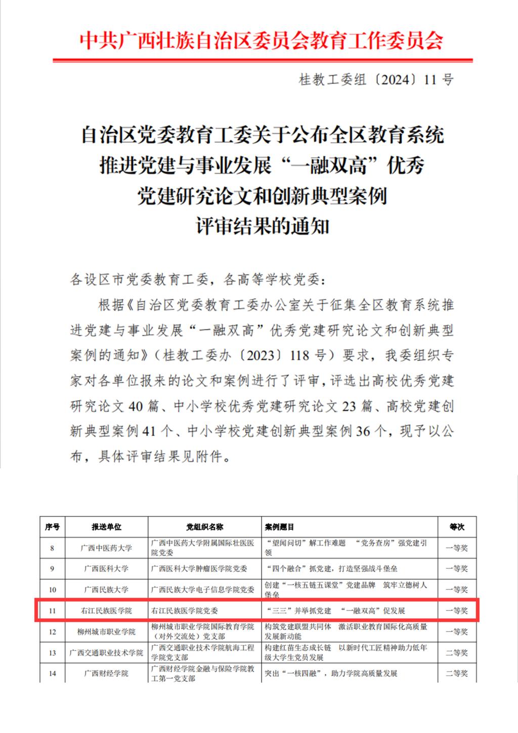 学校党委坚持以习近平新时代中国特色社会主义思想为指导,聚焦全区教育系统推进党建与事业发展“一融双高”重点难点问题,扎实开展教育系统党建工作理论研究,认真总结工作经验,团结带领全校师生弘扬艰苦创业、自强不息的“右医精神”,抢抓“更大申博”发展机遇,积极应对困难挑战,担当作为、团结奋斗,在奋力推进新时代区域性高水平医科大学建设上创造出极不平凡的业绩。