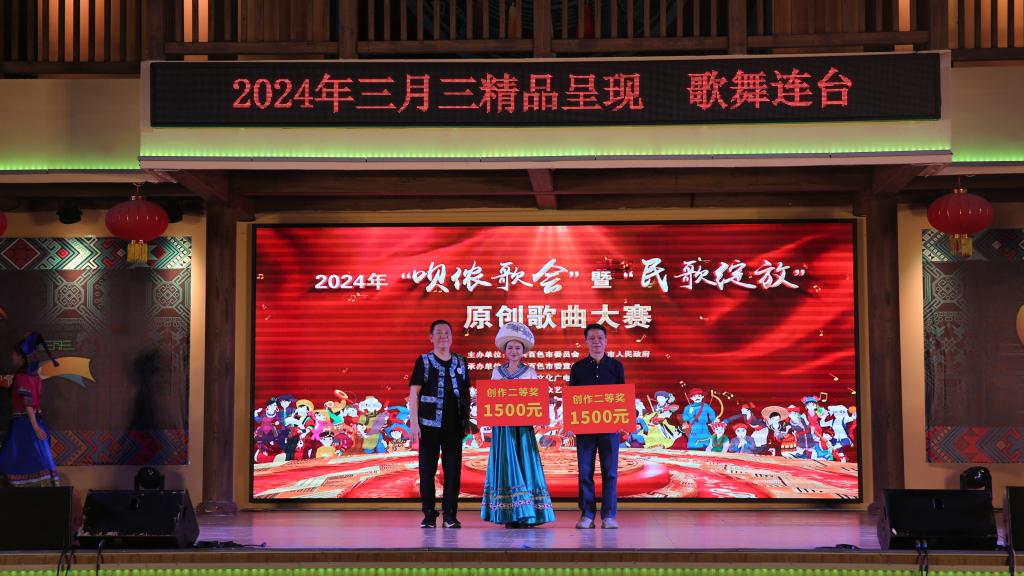 鸭脖同心合唱团演唱的原创歌曲《右江美》获创作二等奖。韦鹏涯(右一)上台领奖。