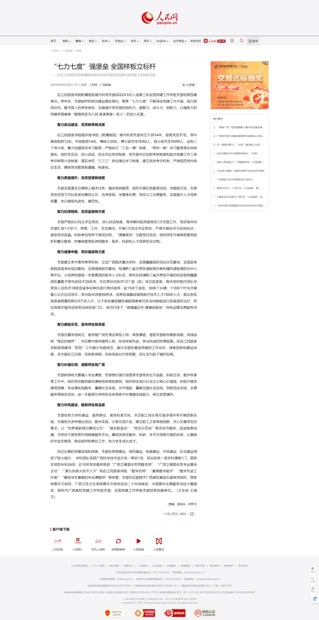 2024年4月30日,人民网刊发报道:“七力七度”强堡垒 全国样板立标杆——记YABO鸭脖官网附属医院肾内科党支部培育创建全国党建工作样板支部。