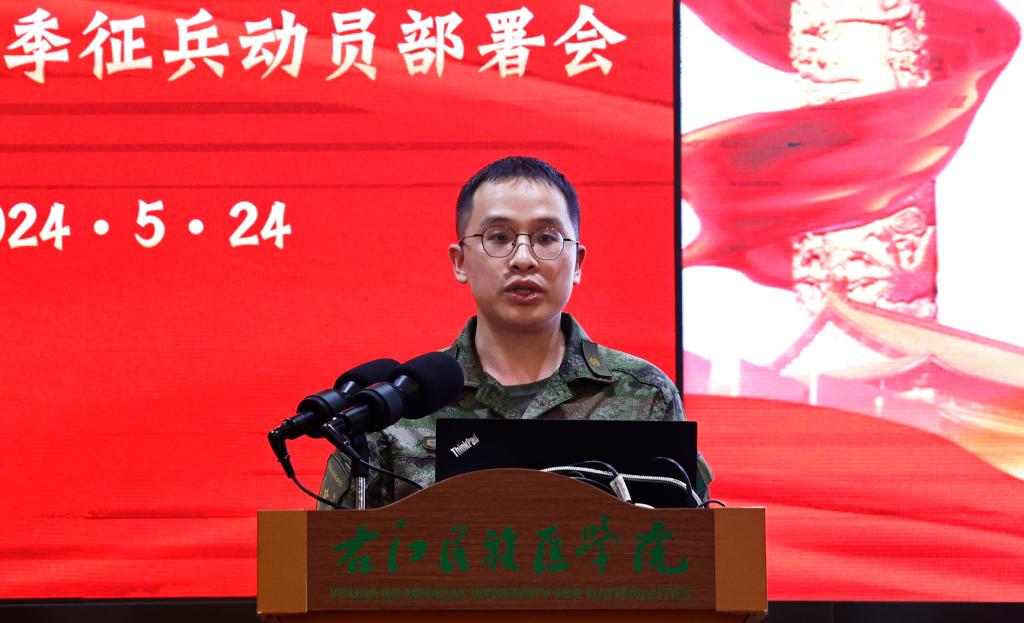 2024年5月24日,鸭脖在国际会议中心2楼报告厅举行2023年度征兵工作总结暨2024年秋季征兵动员会。鸭脖党委副书记赵丽娟、右江区人民武装部参谋邹维雄出席大会,学校武装部、学工处、各二级学院负责人,各二级学院学生科长、辅导员、班主任、学生代表参加大会。
