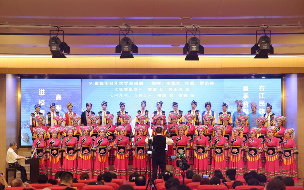 百色市老年大学合唱团演唱《壮美延安》《三月三,九月九》。