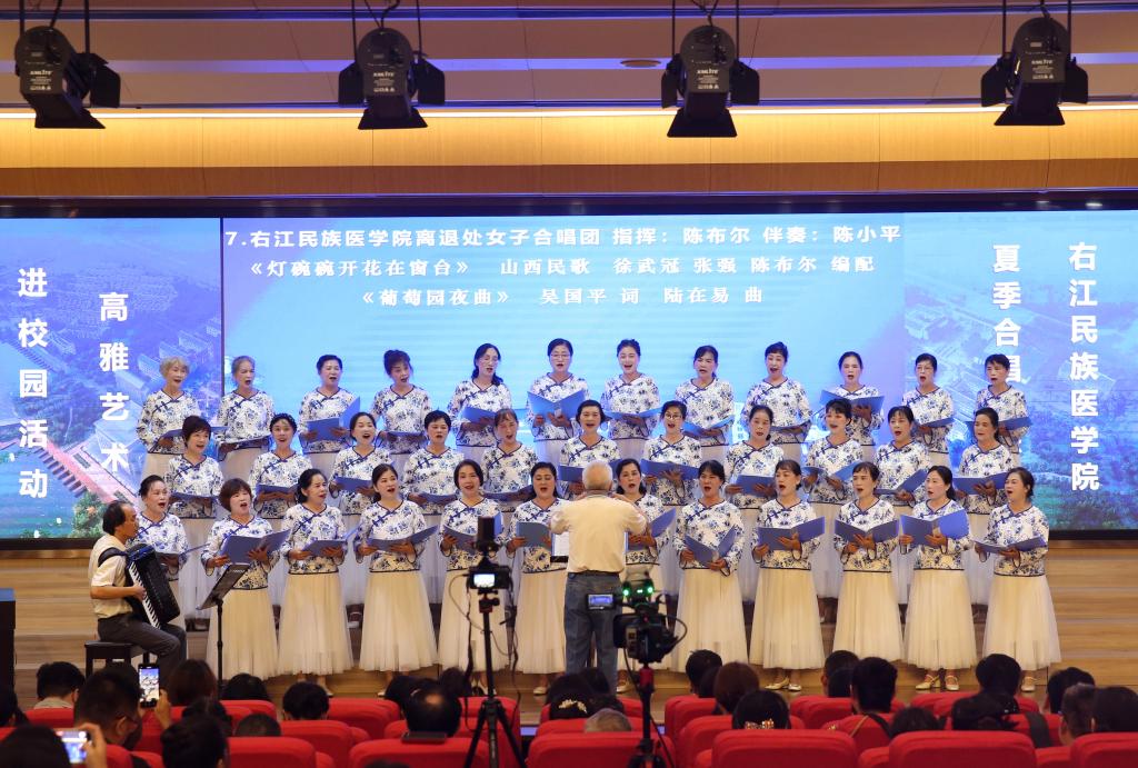 鸭脖离退处女子合唱团演唱《灯碗碗开花在窗台》《葡萄园夜曲》。