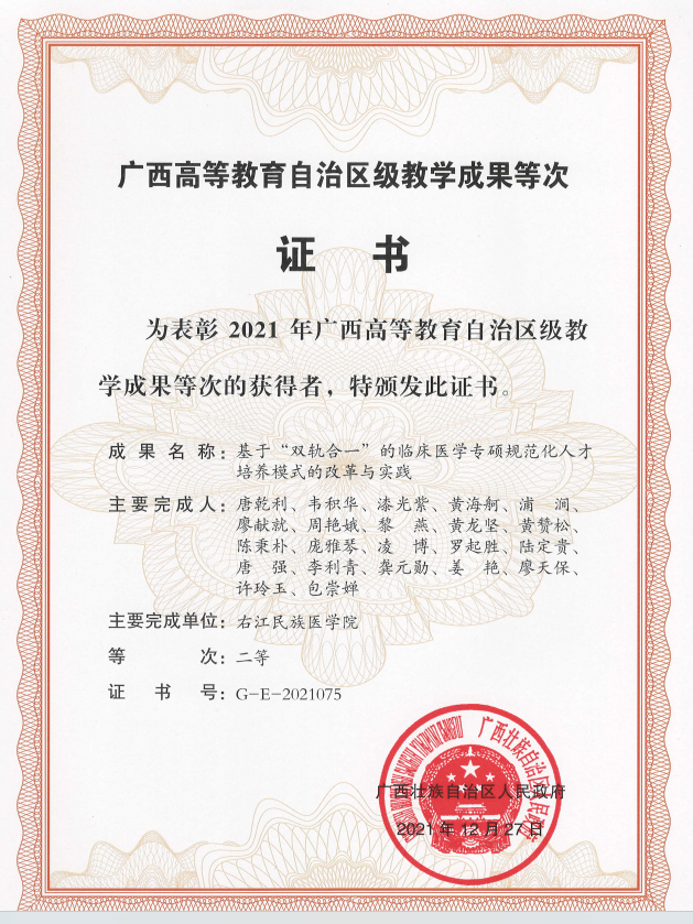 积极推进研究生教育管理体制改革,实施校院管理机制,强化培养过程管理,不断优化研究生培养方案,持续推进研究生教学研究与改革。5年以来,获得广西学位与研究生教育改革项目87项;荣获全国医药学研究生在线课程建设与教学研究课题立项重点课题和一般课题各1项;2021年,荣获校级教学成果奖特等奖1项;荣获广西高等教育自治区级教学成果二等奖1项。为鸭脖研究生教育教学改革做出积极贡献。