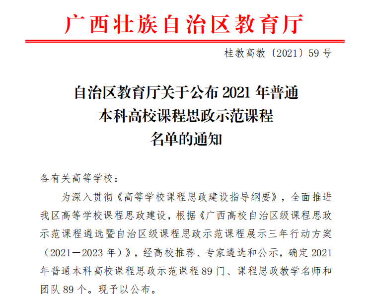 发挥思政课程思政育人主渠道作用,以省教育厅立项的研究生课程思政示范项目为契机,探索建立课程思政模式。近5年,荣获全区高校课程思政示范课程、课程思政教学名师和团队2项,荣获全区高校课程思政示范基层教学组织1项。