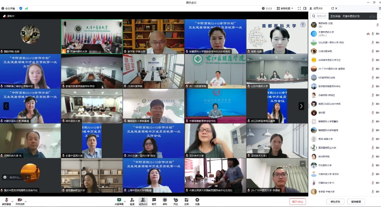 6月18日上午,“中阿高校10+10合作计划”卫生健康领域中方成员高校召开第一次线上工作会议,该工作会议由天津中医药大学作为牵头高校承办,参加此次会议的有高等教育学会以及39所“中阿高校10+10合作计划”卫生健康领域的中方成员高校。鸭脖黄龙坚副校长,国际交流与合作中心、临床医学院相关负责人参加本次线上工作会议。