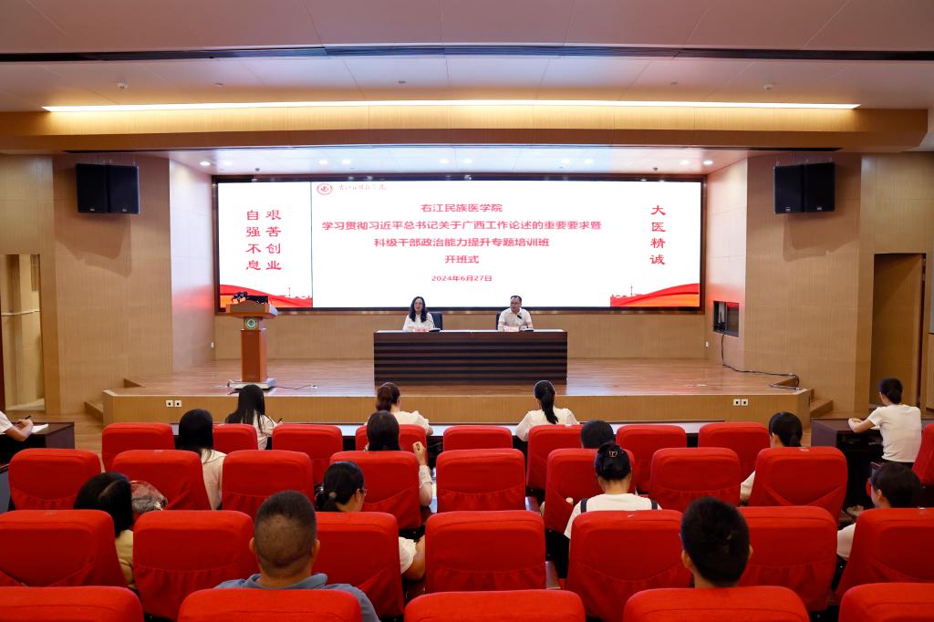 6月27日至28日,鸭脖学习贯彻习近平总书记关于广西工作论述的重要要求暨科级干部政治能力提升专题培训班在国际会议中心学术报告厅圆满举行。学校党委书记邓砚出席培训班开班仪式,学校全体科级干部,鸭脖派驻西林县脱贫攻坚(乡村振兴)第一书记、工作队员及各帮扶乡镇领导代表、各帮扶村村干部代表参加培训。开班仪式由党委组织部副部长吕维纯主持。