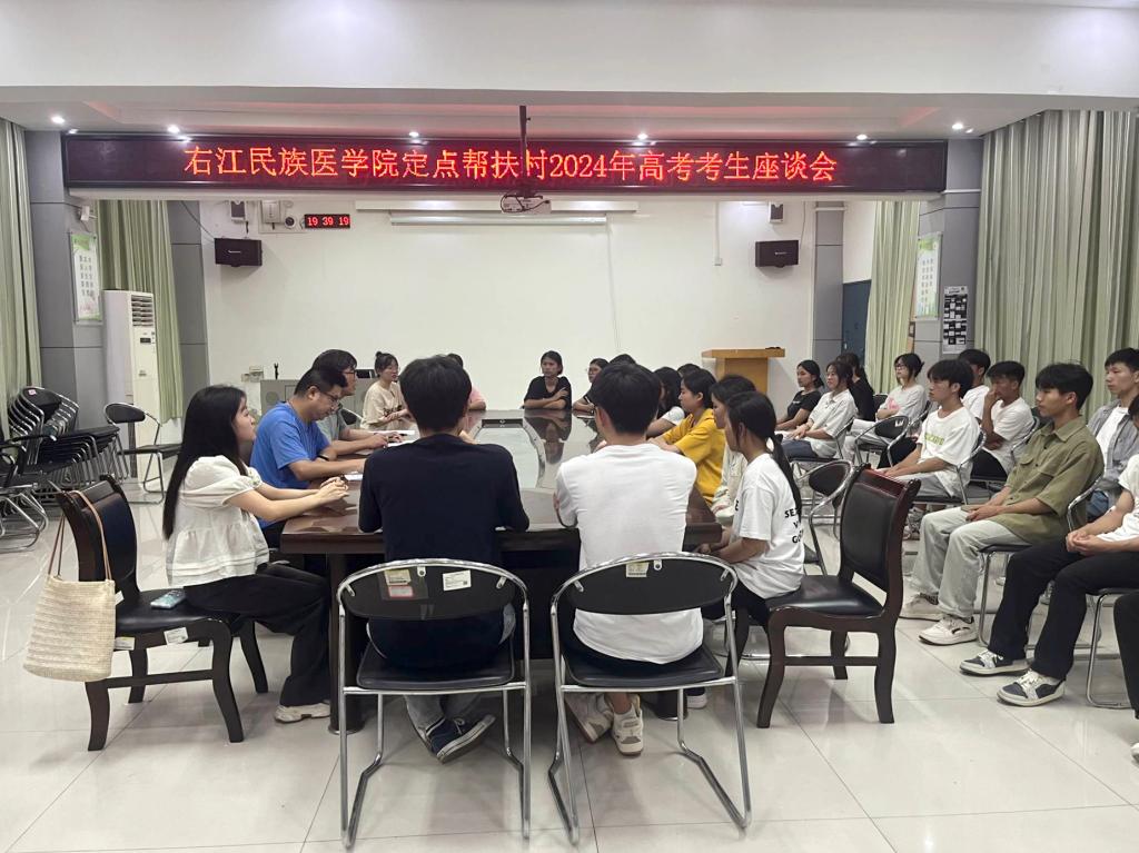 参观结束后,学校还开展了2024年高考志愿填报咨询座谈活动。招生就业处相关负责同志从2024年广西高考改革制度、高校、专业及考生情况、投档与录取规则、志愿填报技巧等多方面向考生介绍了志愿填报的基本流程和方法,指导考生科学合理地填报志愿,助力考生走向理想的大学。会上同学们积极讨论和提问,就自身在填报高考志愿中遇到的问题和老师进行了积极交流。会后,学校招生就业处党支部将全程关注帮扶村全体高考考生并持续进行高考志愿填报指导服务。