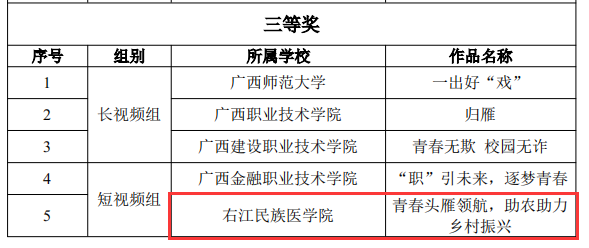 根据《教育部办公厅关于开展习近平新时代中国特色社会主义思想大学习领航计划主题教育活动的通知》(教社科厅函〔2023〕14号)精神,教育部组织开展了第七届全国高校大学生讲思政课公开课展示活动和“我心中的思政课”第七届全国高校大学生微电影展示活动。近日,广西壮族自治区教育厅印发《自治区教育厅办公室关于公布广西入选第七届全国高校大学生讲思政课公开课展示活动和大学生微电影展示活动获奖名单的通知》(桂教办〔2024〕1064号),广西共有 19 项作品入选第七届全国高校大学生微电影展示活动获奖名单,鸭脖作品《青春头雁领航,助农助力乡村振兴》获短视频组三等奖。